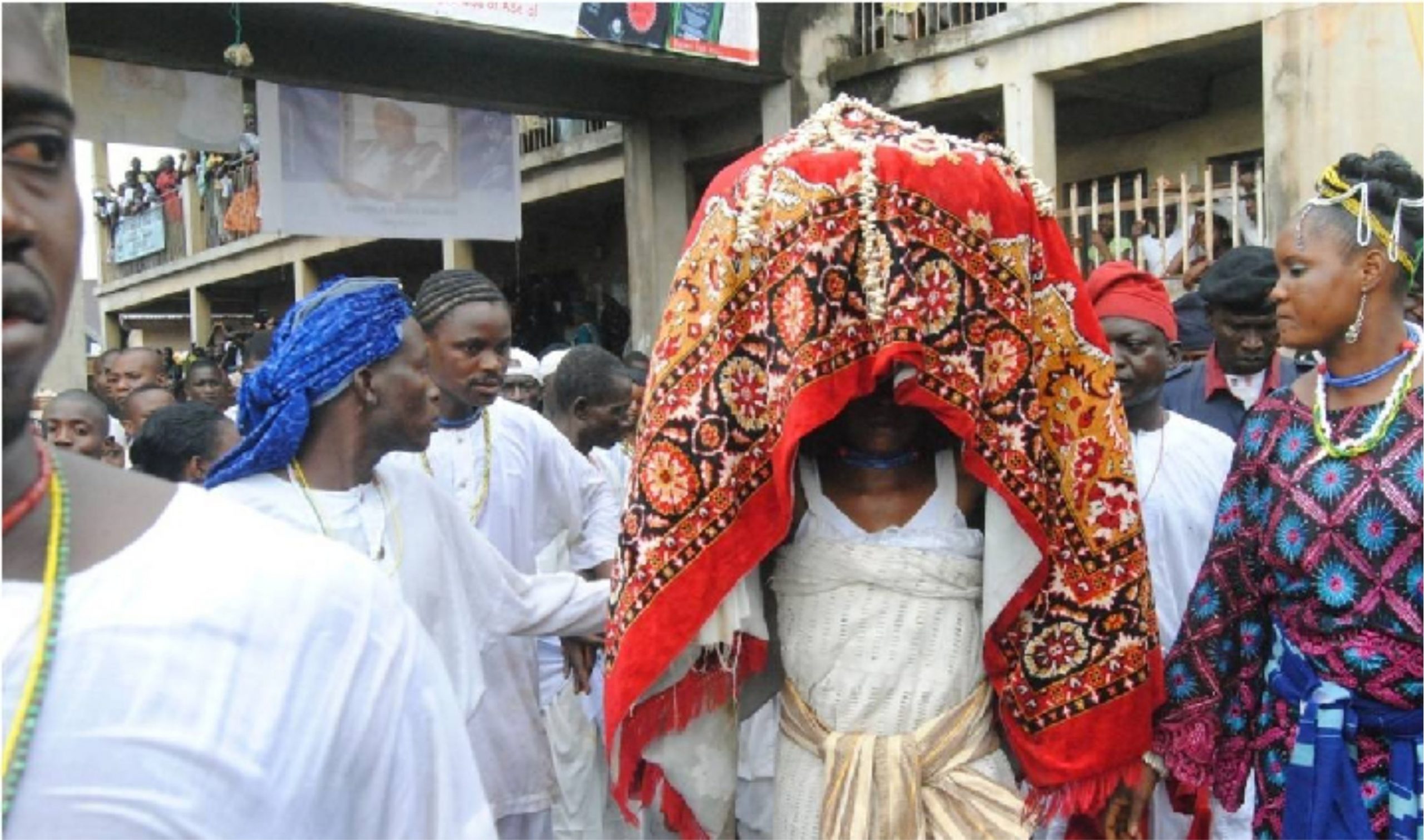 The Festival culminates in a procession to the shrine in the sacred grove where a large crowd builds up. Drumming, dancing, musical performing, wearing of elaborate costumes, speaking of the Yoruba language, recitation of praise poetry, and so on add pomp and colour to the proceedings. This event is led by the sitting Ataoja of Osogbo along with a ritualized performer called the Arugba and a committee of priestesses, who reenact the very first meeting between Oluwatimilehin and Yeye Osun. Arugba is played by a young woman of a kingly lineage and offers the sacrifice to the deity.